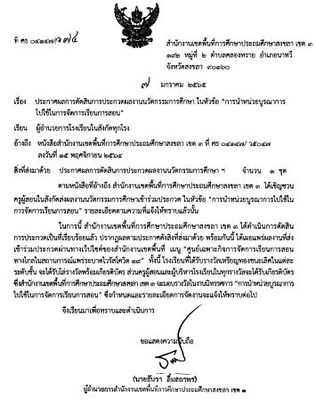 | ขอแสดงความยินดีกับคุณครูโรงเรียนบ้านลำลองที่ได้รับรางวัลผลงานผลงานนวัตกรรมการศึกษา ในหัวข้อ "การนำหน่วยบูรณาการไปใช้ในการจัดการเรียนการสอน" ตามเอกสารแนบ |